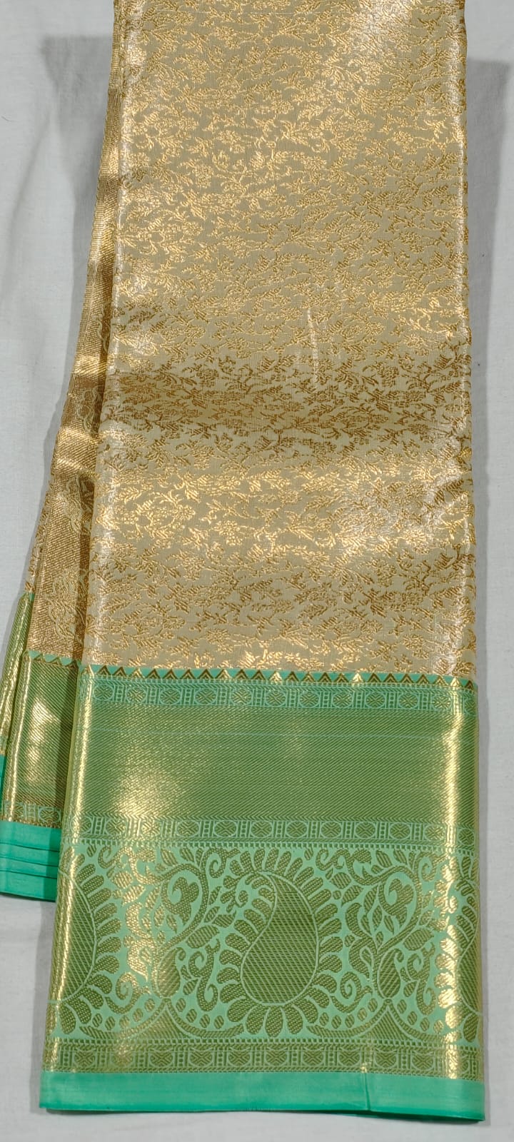 Cream gold kanchi pattu sarees online at Hyderabad Bangalore contrast green border buy online or Visit