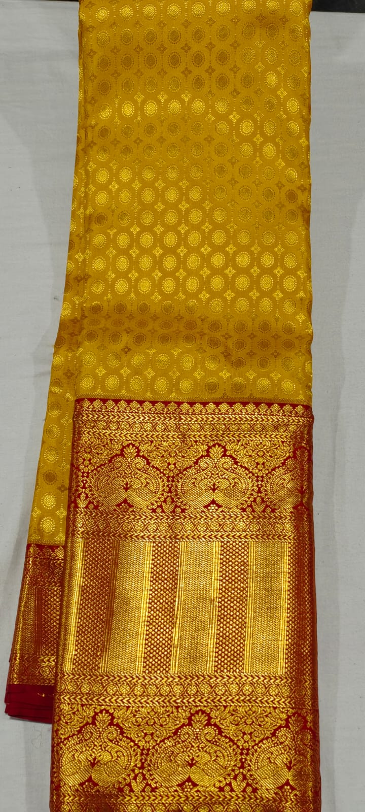 Yellow kanchipuram silk saree online at Hyderabad Bangalore contrast red border buy online or Visit 𝗛𝘆𝗱𝗲𝗿𝗮𝗯𝗮𝗱 𝗦𝗵𝗼𝗽 :